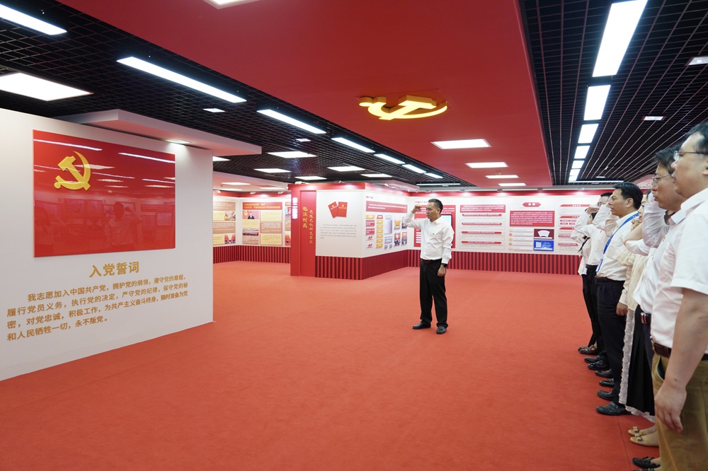 結束參觀(guān)前,全體黨員面對鮮紅的黨旗舉起右拳,重溫入黨誓詞,鏗鏘的誓言響徹展廳。
